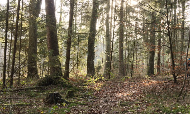 Ab dem Waldrand sind es noch ca. 100 Meter bis zu einem Trampelpfad, diesem folgt man nach Links weiter in den Wald (ein Feldstein markiert die Abzweigung). Der Weg ist hier schmal und oft bis in den Hochsommer matschig. Wer sich die Pfützen genauer anschaut, wird in der entsprechenden Saison auf Laich stoßen – also unbedingt aufpassen, wo man hintritt. Es können durchaus auch mal Bäume quer über den Weg liegen, manchmal muß also ein wenig geklettert werden. Nach einer Weile überquert man ein Bächlein, das nun rechterhand im „Tal“ dahin plätschert, während der Pfad etwas steiler bergauf geht. Der Pfad wird dann auch etwas breiter und stößt schließlich auf einen Waldweg („Blauer Kreis“), dem man linker Hand folgt.